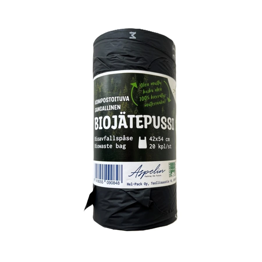 A. Grönt fastspänd komposterbar bioavfallspåse 20 liter. Storlek 42×52 cm, tjocklek 15 my. Tillverkad av certifierad mater-bi biofilm som bryts ner i hemkompost. 20 st i rulle.