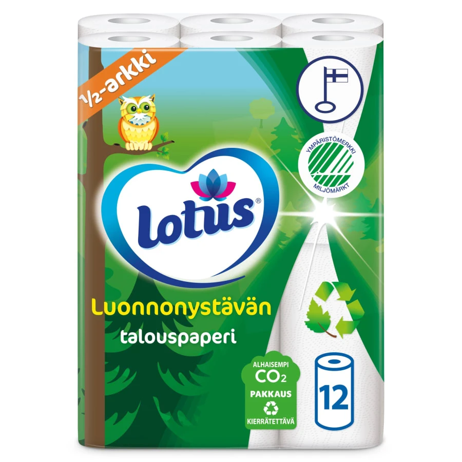 Lotus Luonnonysjaft’s paper towels are made from wood fiber pulp made from recycled fiber, i.e. recycled paper. Made from recycled paper, Lotus Luonnonysjavtan paper towels are slightly darker in color than paper made from new fiber, but durable and absorbent like other Lotus paper towels. All Lotus Luonnonysvatti products are manufactured in Finland at Nokia’s paper mill. Made from FSC certified fiber. 100% recyclable packaging.