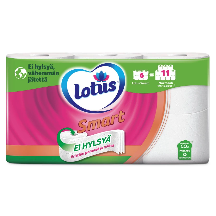Lotus Smart är ett högkvalitativt toapapper utan kärnor med dubbelt så många ark som en vanlig rulle. Tack vare detta innovativa toapapper utan kärnor behöver du inte längre slänga kartongkärnor i papperskorgen och rullbytesintervallet är längre. Lotus Smart toalettpapper är ett vettigt alternativ till traditionellt toalettpapper, eftersom det tar hand om din familj och gör vardagen i hushållen lite trevligare. Tillverkad av cellulosa.