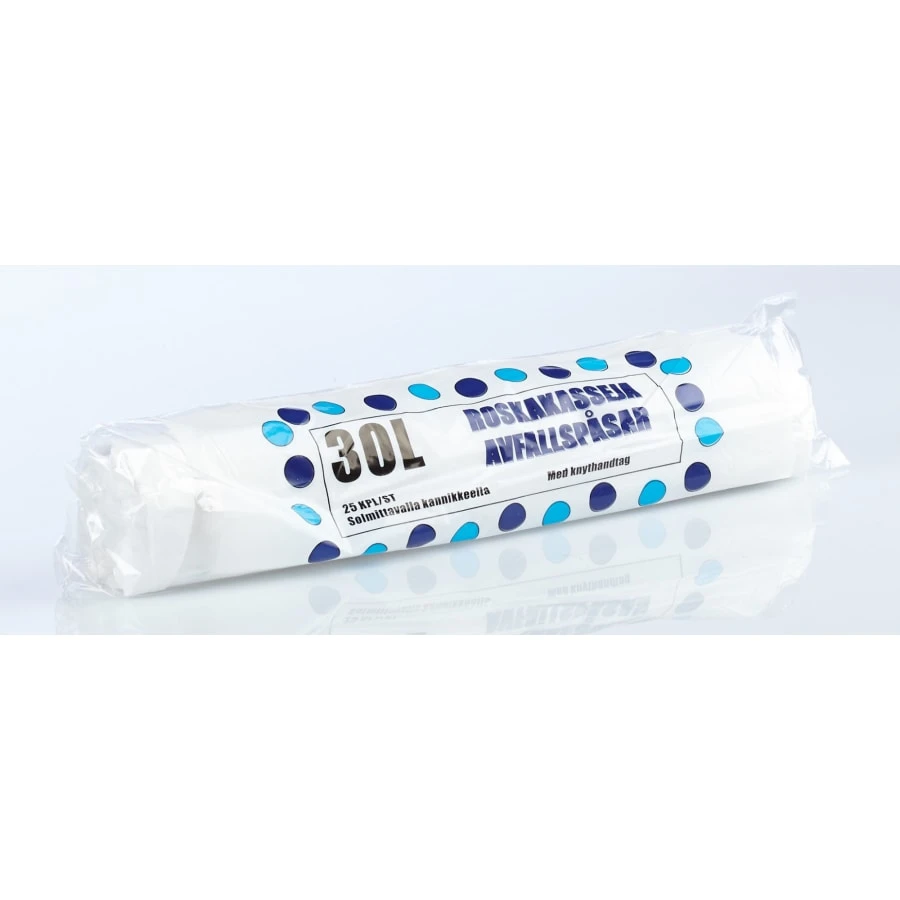 Affordable 30 litre white garbage bag with carrying handles (25 pc/roll). Size of the bag: 470 x 600 mm.