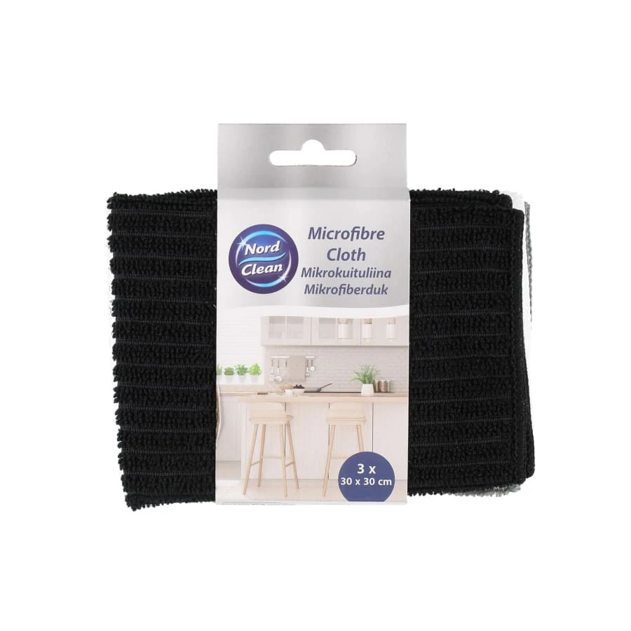 Lint-free cloth. Black, grey and white. For general cleaning when damp and for dusting when dry. Do not use fabric softner when washing the item in the washer. 250 gsm. 30 x 30 cm.