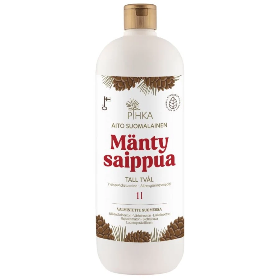 The natural cleaning power of pine soap has been known in Finland for a long time. Pine soap is an effective, nature-friendly and versatile general cleaning agent. Cleaning power of pine oil derived from pine tree resins. Excellent washing power and a fresh scent guarantee a pleasant clean result. PIHKA pine soap contains no preservatives or additives, and neither it contains any synthetic dyes or perfumes. Areas of application: carpets, floors, oven, kitchen, bathroom.